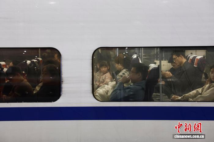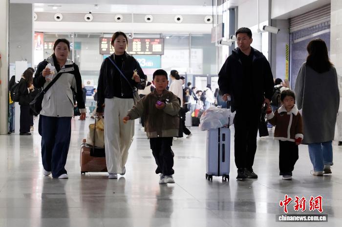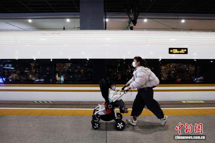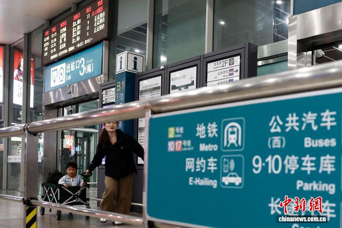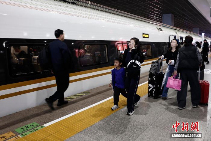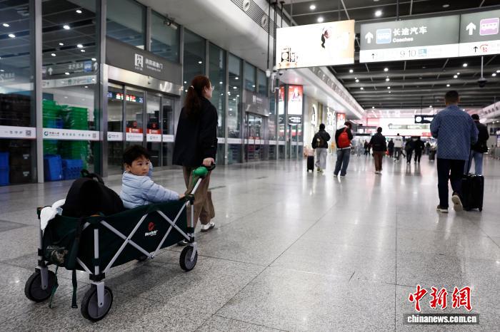 4月3日,正在铁道上海虹桥站,搭客带着儿童趁坐下铁列车前去本身的目标天。中新社记者 殷坐勤 摄