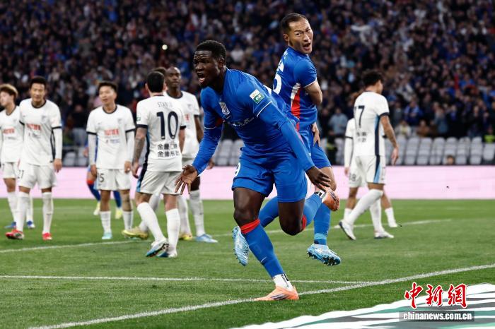 3月7日,申花队球员马克塔·盖伊入球后喝彩。当日,2026赛季中原脚球超等联赛第1轮角逐中, 上海申花队(蓝衣)主场5比3胜年夜连英专队。 中新社记者 殷坐勤 摄