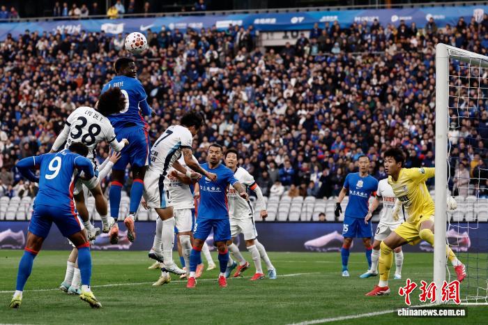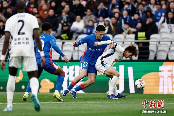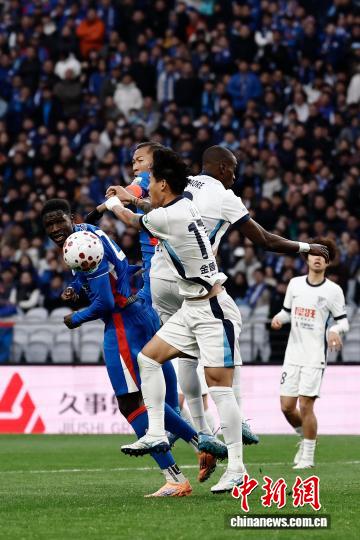 3月7日,两边球员正在角逐中争球。当日,2026赛季中原脚球超等联赛第1轮角逐中, 上海申花队(蓝衣)主场5比3胜年夜连英专队。 中新社记者 殷坐勤 摄
