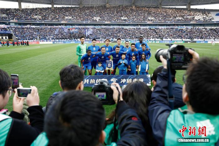 3月7日,申花队球员赛前开影。当日,2026赛季华夏脚球超等联赛第1轮角逐中, 上海申花队(蓝衣)主场5比3胜年夜连英专队。 中新社记者 殷坐勤 摄