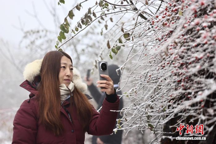 图为一名外洋华媒代替正在海螺沟景区拍摄雪景。中新社记者 王磊 摄